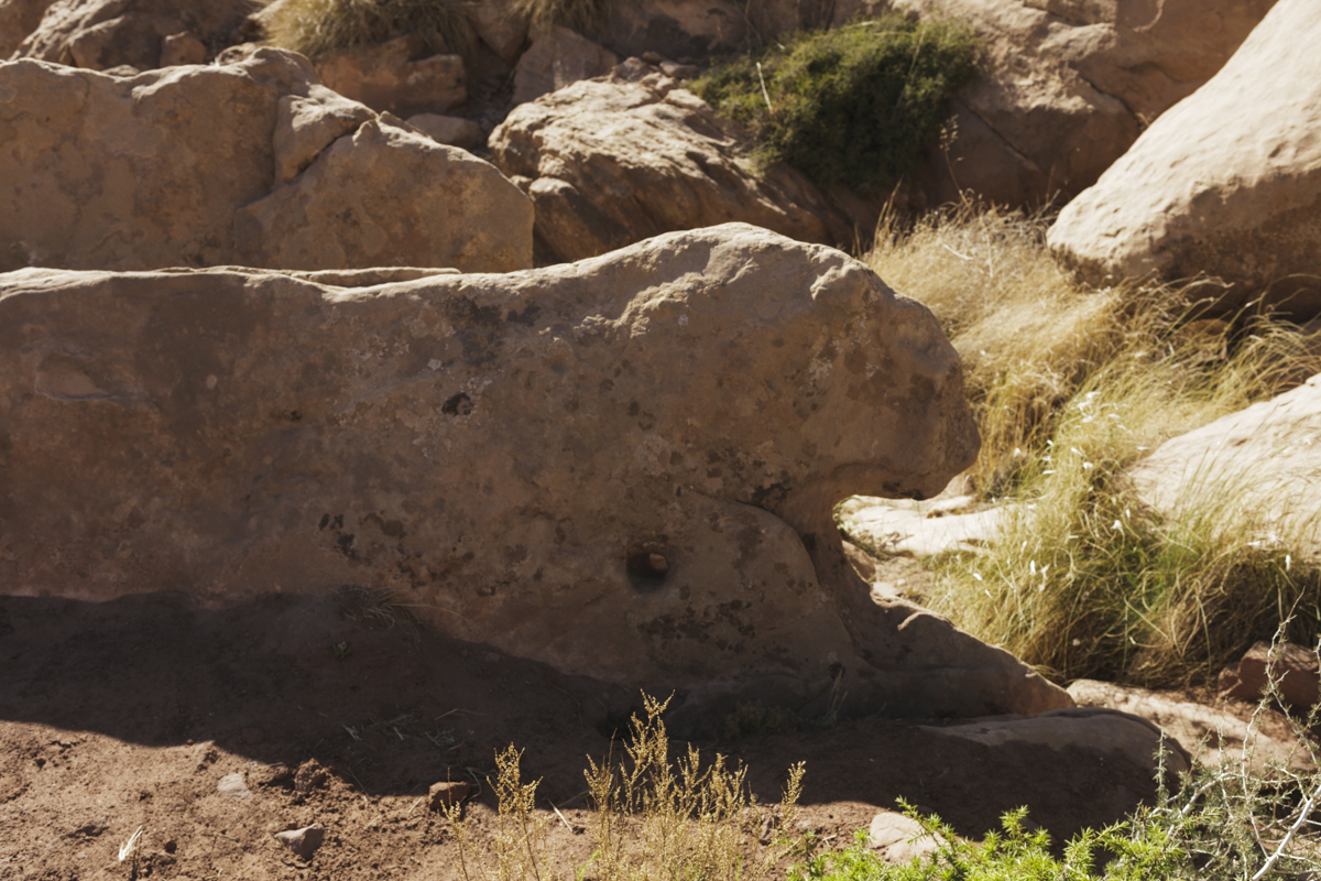 Le paysage qui s’offrit à moi était encore plus beau. En bas, les traces d’un village berbère étaient visibles. Régulièrement, le guide se penchait et ramassait une pierre, un éclat taillé de silex qu’il m’offrait, un grattoir, une lame tranchante. Je tenais mes cadeaux pour mon petit Naïm. La plus belle trouvaille fut une pointe de flèche grossièrement taillée, Naïm sera content. En haut, une lionne dans la pierre, une femme sexuée dans la roche, le sexe représenté dégradé ; non pas effacé, mais affirmé. Le site n’est pas protégé, les gravures sont souvent reprises par des visiteurs locaux qui en repassent les traits pour qu’elles soient plus visibles. Autre désastre.