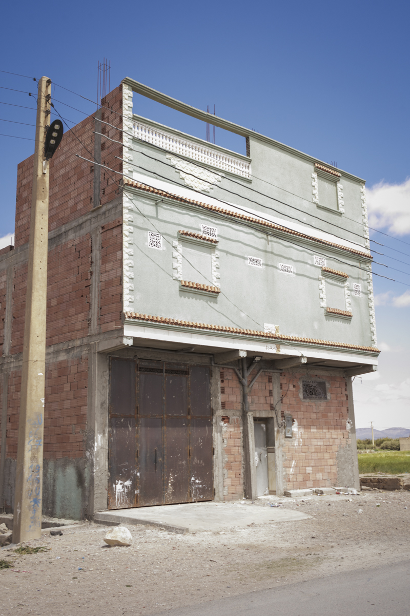 Les habitants de Dar Chioukh, comme partout, construisent dans un premier temps un garage fermé par une lourde porte en métal brut qu’ils mettent tout de suite en location. C’est une manière d’avoir un petit revenu qui complète une maigre pension, un petit salaire de fonctionnaire, ou l’argent apportée par un membre de la famille qui travaille et qui aide, souvent, dix personnes à vivre. Un numéro de téléphone est écrit sur la plupart des garages, le contact nécessaire pour mettre en location, dans une ville où il n’y a pas ou peu de voitures.