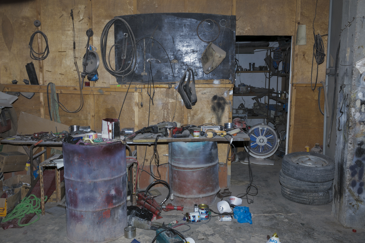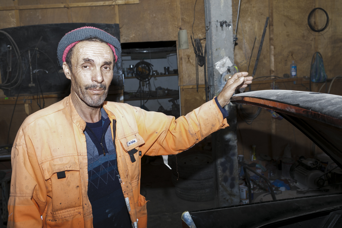 L’après-midi, visite chez Saïd le tôlier, le garagiste, le génie de la remise en état d’épaves automobiles. Saïd paraissait naturellement affecté, quelque chose d’insondable sur son visage qui me faisait penser à un clown triste, pas celui dont on se moque, celui qui n’arrive pas à prendre prise sur le réel. Il me montra fièrement ses « garages » remplis d’épaves en reconstruction, l’atelier de découpe de métal, de bourrellerie où il réparait les intérieurs, sa machine à coudre, les carcasses en cours de restauration, le camion « food truck » qu’il décorait, du « tuning » comme il me dit. Pas de pont dans ce garage, la plupart du temps les opérations se passent dans la rue, à la poussière. Saïd était heureux de me voir, et satisfait que je prenne des photographies. Il recevra, bientôt, un livre de celles-ci.